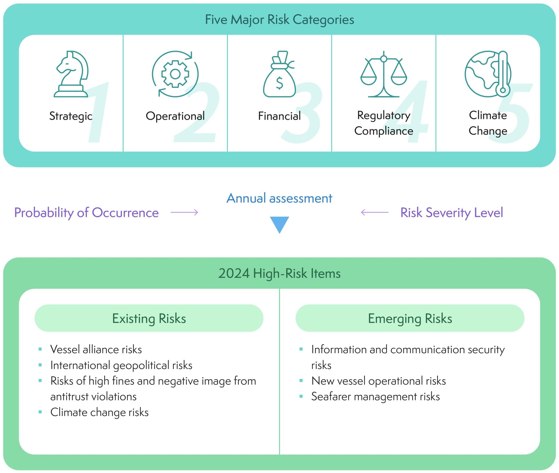 In 2024, there were 43 units under evaluation (including headquarters, Keelung/Taichung/Kaohsiung branch offices, subsidiaries, and regional centers). The assessment content covered multiple aspects including various operational activities, regulatory compliance, climate change, international geopolitics, information security, and integrity management, totaling 520 risk assessment items. After consolidation, there were seven high-risk items for this year: vessel alliance risks, international geopolitical risks, new vessel operational risks, seafarer management risks, information and communication security risks, risks of high fines and negative image from antitrust violations, and climate change risks. Among these, new vessel operational risks, seafarer management risks, and information and communication security risks are emerging risk items newly added this year.