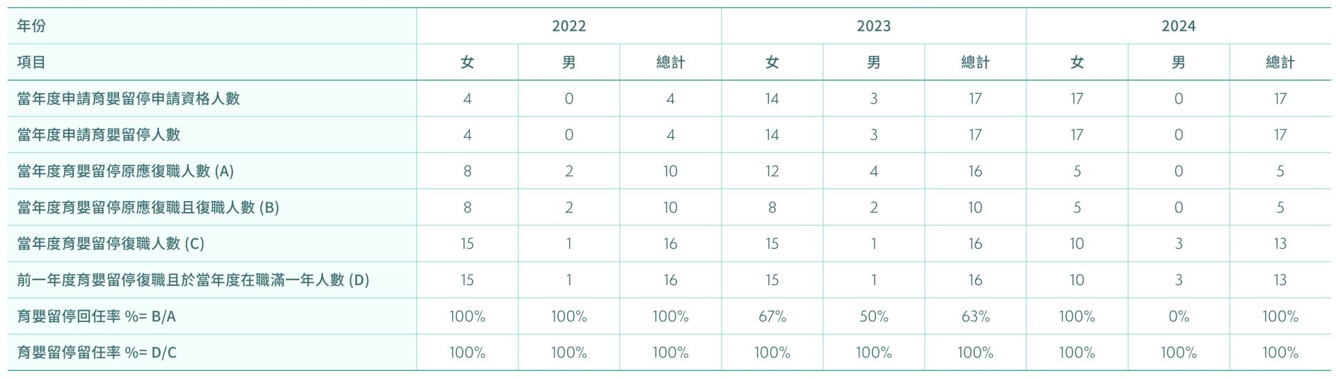 為響應政府推動公共托育政策與提供員工更便利友善之職場托育環境,本公司於基隆市信一辦公大樓設置職場互助教保服務中心,並已於2022 年8 月15 日正式啟用,本教保中心招收2 至6 歲學齡前幼兒,並以員工子女及孫子女為優先,學費比照非營利幼兒園收費每月僅需新台幣2,000 元,大幅減輕員工育兒經濟負擔,讓員工可安心生養、兼顧工作與家庭平衡,促進友善育兒職場環境。