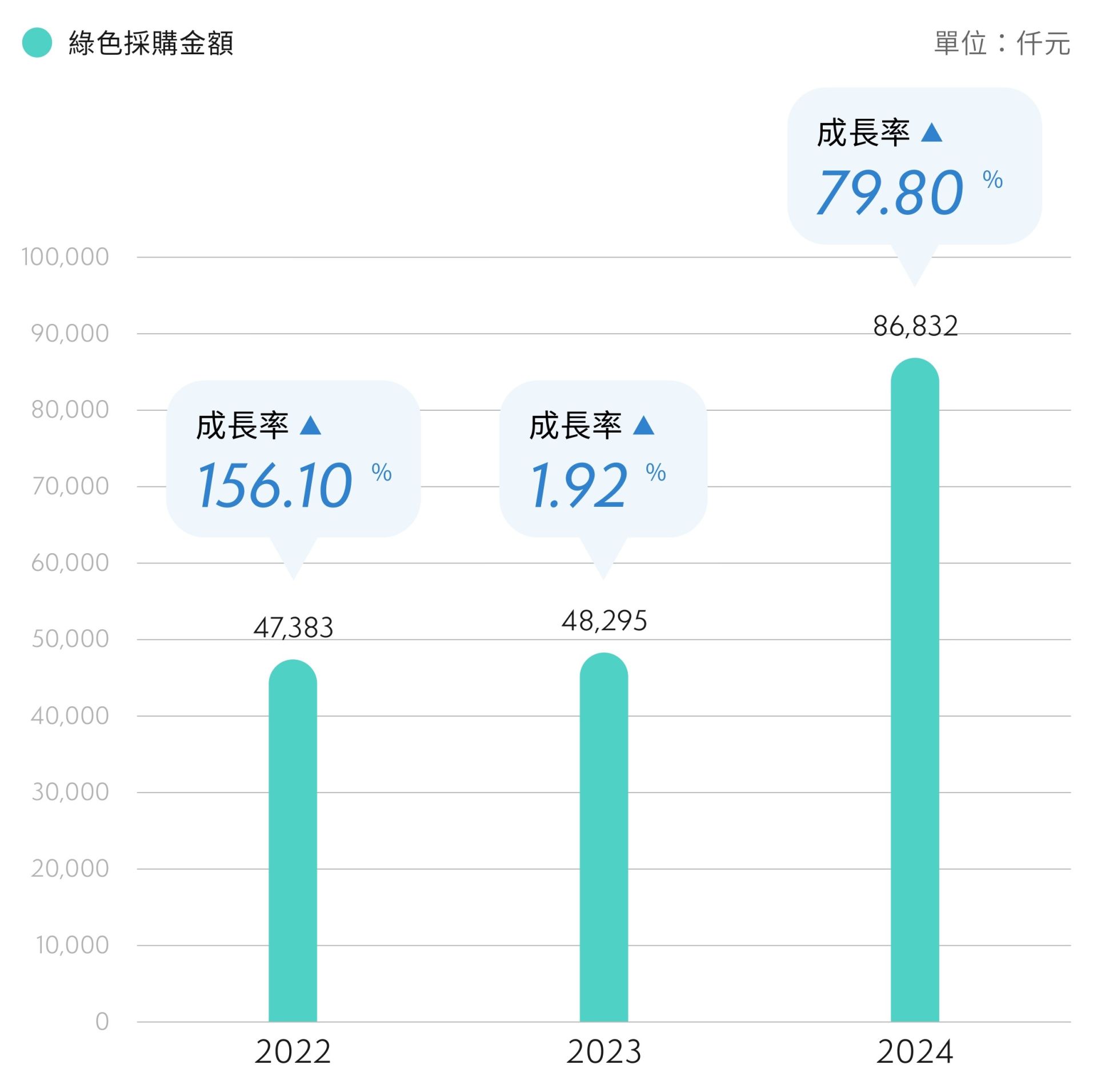 自2013年開始響應環境部全民綠生活綠色採購活動,本公司已連續4年 榮獲基隆市政府頒發「民間企業綠色採購之優良企業」,2024年綠色採購 金額達新臺幣86,832,417元,較2023年成長79.80%。成長主因為再生 能源採購範圍由七堵辦公大樓擴大至基隆、高雄等自有辦公室,並涵蓋公 務車與電腦設備採購,進一步提升環保採購規模與效益。